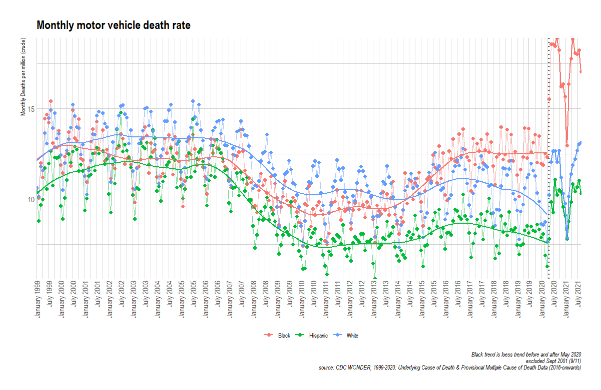 Random Critical Analysis has created this graph from CDC cause-of-death monthly data on motor vehicle death rates (per person, not per miles driven) from January 1999 to July 2021. Black death rates are in red, white in blue, Hispanic in green. Unlike FBI crime rates, the CDC, working from death certificates, does a reasonable job distinguishing whites and Hispanics.
