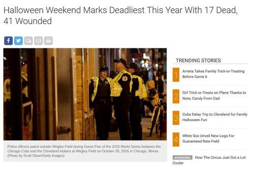 Halloween Weekend Marks Deadliest This Year With 17 Dead, 41 Wounded[Comment at Unz.com]At least 17 people, including four teenagers, were killed and 41 others were wounded in shootings across Chicago between Friday evening and Monday morning, making it the city’s deadliest weekend of the year.