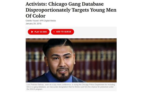 … Activists in Chicago claim these gang databases are doing more harm than good. Over time, Chicago’s list has grown to include almost 65,000 people whom the police consider gang-affiliated. More than 95 percent are African-American or Latino, and young activists say police are irresponsibly and disproportionately labeling young men of color as gang members. Immigrants, in particular, say the city’s list is full of errors and leading to some deportations.