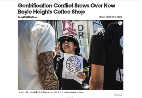 Similar to last year’s “artwashing” protests against new art galleries in Boyle Heights, the demonstrators regard the presence of the coffee shop as a harbinger of coming threats to affordable housing for low-income families in the largely working-class and Mexican neighborhood. Some say Boyle Heights could experience the same redevelopment boom that transformed its neighbor, downtown’s Arts District, from a deteriorating industrial zone to one of the most desirable and costly rental markets in the city.