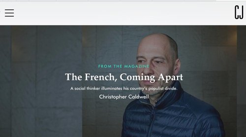 People tend to snicker when the question of political correctness is raised: its practitioners because no one wants to be thought politically correct; and its targets because no one wants to admit to being coerced. But it determines the current polarity in French politics. Where you stand depends largely on whether you believe that antiracism is a sincere response to a genuine upsurge of public hatred or an opportunistic posture for elites seeking to justify their rule.I believe the Wall Street Journal has an opening in its columnist list since former Jerusalem Post editor Bret Stephens moved over to the New York Times to bring an apparently unique perspective not adequately conveyed by Roger Cohen, David Brooks, and/or Tom Friedman. Caldwell would be an ideal addition to the WSJ roster.