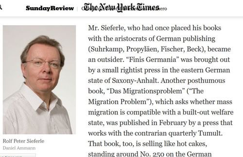 A socialist in his youth like most German intellectuals of the 1968 generation, Mr. Sieferle was drifting out of sync with that tradition by the 1990s. He came increasingly to aim his sarcasm at naïve idealists. At the height of Germany’s refugee crisis two summers ago, he wrote, “A society that can no longer distinguish between itself and the forces that would dissolve it is living morally beyond its means.” …