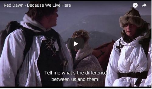 This is a reference to what is turning out to have been one of the key intellectual debates of the late 20th Century, between noted savants Charlie Sheen and Patrick Swayze in John Milius’s Red Dawn: