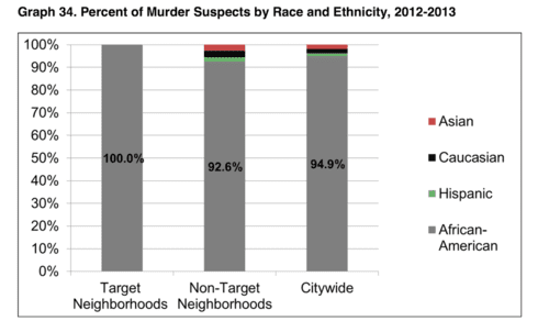 As shown in Graph 33 (page 46), most suspects who were arrested for a murder that occurred in 2012-2013 were male (86.6%) and African-American (94.9%; see Graph 34 on page 46). Over two-fifths of the suspects (42.0%) were under the age of 21 (median=22.0 years; mean=24.0 years; range: 14-55) (see Graph 35 on page 47). We also examined the age difference of victims and suspects (see Graph 36 on page 47). Two-thirds (65.5%) of suspects were younger than their victims, 6.5% were the same age, and 28.0% were older than their victims. On average, suspects were 5.1 years younger than their victim (median: 5.0 years younger; range: -48 to +38 years).