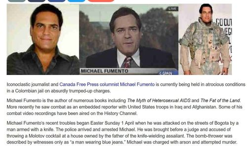 Iconoclastic journalist and Canada Free Press columnist Michael Fumento is currently being held in atrocious conditions in a Colombian jail on absurdly trumped-up charges.Michael Fumento is the author of numerous books including The Myth of Heterosexual AIDS and The Fat of the Land. More recently he saw combat as an embedded reporter with United States troops in Iraq and Afghanistan. Some of his combat video recordings have been aired on the History Channel.