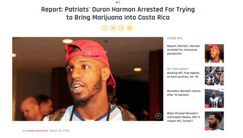Patriots safety Duron Harmon was arrested at Juan Santamaria International Airport in Costa Rica for possession of Marijuana, according to Costa Rican news website La Nación. Harmon, 27, was allegedly in possession of 58 grams [2 ounces] of marijuana and was briefly detained before being sent back to the United States.Sports Illustrated’s source was Costa Rica’s La Nación , which supplies more information. It says that the marijuana was in Harmon’s suitcase, inside a soft drink can (photo here)Report: Patriots' Duron Harmon Arrested For Trying to Bring Marijuana Into Costa Rica