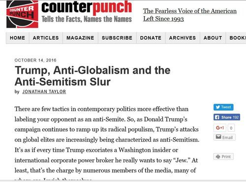 OCTOBER 14, 2016 Trump, Anti-Globalism and the Anti-Semitism Slur by JONATHAN TAYLORThere are few tactics in contemporary politics more effective than labeling your opponent as an anti-Semite. So, as Donald Trump’s campaign continues to ramp up its radical populism, Trump’s attacks on global elites are increasingly being characterized as anti-Semitism. It’s as if every time Trump excoriates a Washington insider or international corporate power broker he really wants to say “Jew.” At least, that’s the charge by numerous members of the media, many of whom are Jewish themselves.