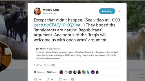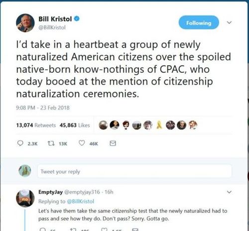 In Another “Mask Comes Off” Moment For Bill Kristol: The “Native-Born Know-Nothings Of CPAC”, I noted that Bill Kristol [Email him]had Tweeted "I’d take in a heartbeat a group of newly naturalized American citizens over the spoiled native-born know-nothings of CPAC, who today booed at the mention of citizenship naturalization ceremonies."