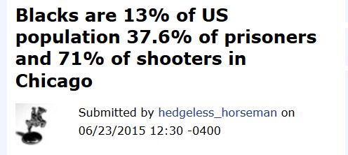 First, I wanted to look at more data than just the police report of our local paper. What I found is... ... [Blacks are 13% of US population, 37.6% of prisoners, and 71% of shooters in Chicago by "hedgeless_horseman"; ZeroHedge, June 23rd 2015.]
