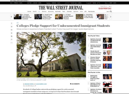 [Colleges Pledge Support for Undocumented Immigrant Students (mirror), by Melissa Korn and Alejandro Lazo, WSJ (pay site), November 23, 2016]