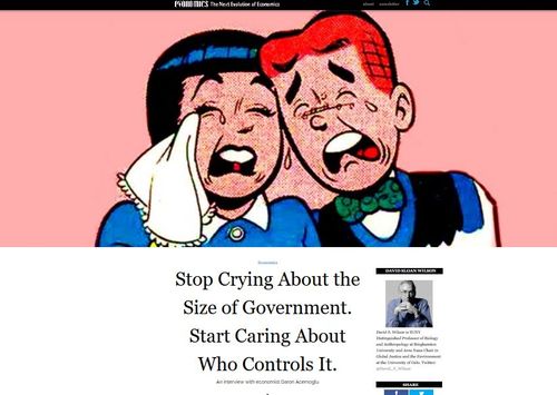 Stop Crying About the Size of Government. Start Caring About Who Controls It. An interview with economist Daron Acemoglu by David Sloan WilsonEconomists tend to be better at thinking about abstractions than about messy empirical realities, which is fine. The problem comes when economists make some assertion about history that would not impress historians, but gets a free pass from their fellow economists because what do economists know about history.