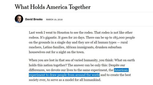 Despite our differences, we devote our lives to the same experiment, the American experiment to draw people from around the world …Can Mr. Brooks find any quotations from the Federalist Papers, the Declaration of Independence, the Preamble, or Washington’s Farewell Address to support his assumption that “the American experiment” was about immigration rather than self-government?