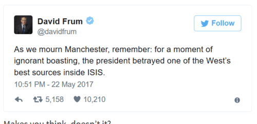 David Frum: Take a moment while mourning Manchester dead to remember Trump’s intel leak by Brett T., Twitchy.com,Posted at 11:40 pm on May 22, 2017.