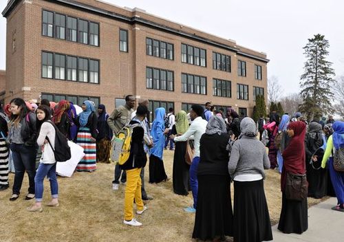 Above, Somalis in Minnesota protest outside a school.
