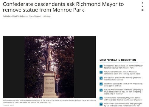 The Richmond Times-Dispatch offers this one today: "Descendants: Remove Confederate general's statue from Monroe Park: