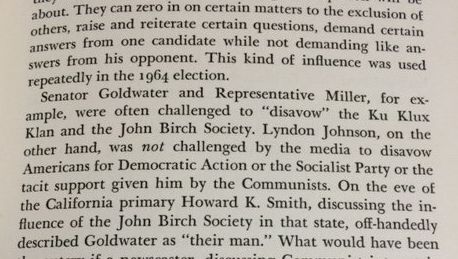 Perhaps the most awesome power of the national media—a power usually neglected in squabbles over "misquotation"—is the power to define the issues. While television and the magazines and the press cannot manufacture public opinion, they can in large part decide what public opinion will be about. They can zero in on certain matters to the exclusion of others, raise and reiterate certain questions, demand certain answers from one candidate while not demanding like answers from his opponent. This kind of influence was used repeatedly in the 1964 election.Senator Goldwater and Representative Miller, for example, were often challenged to "disavow" the Ku Klux Klan and the John Birch Society. Lyndon Johnson, on the other hand, was not challenged by the media to disavow Americans for Democratic Action or the Socialist Party or the tacit support given him by the Communists. On the eve of the California primary Howard K. Smith, discussing the influence of the John Birch Society in that state, off-handedly described Goldwater as "their man." What would have been the outcry if a newscaster, discussing Communist interest in the election, had casually referred to Lyndon Johnson as "their man"?