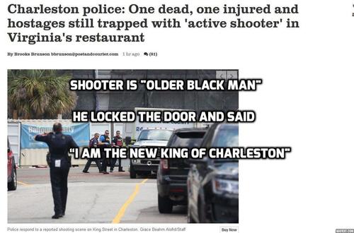 There is an "active shooter situation" in a popular tourist and commercial area of downtown Charleston, according to police spokesman Charles Francis. King Street is currently closed between Calhoun and Morris Streets.How does he know it's not a hate crime? Presumably, because "hate crimes" involve white people targeting minorities, and if a black employee targets his white employers or customers, that's not hate. In fact, it is, and we've noted a number of crimes we call "Disgruntled Minority Massacres".Employees working in the area near Virginia's On King, a Southern cuisine restaurant, said they were on lockdown as authorities swarmed the area. Several people have said the active shooter situation appears to have started within Virginia's.