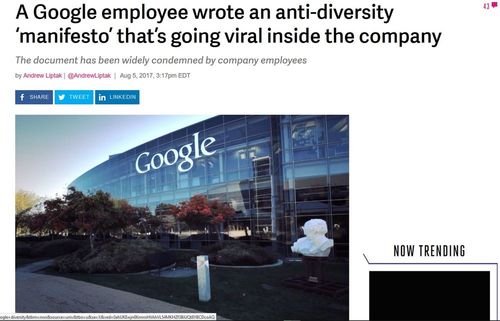 Keep in mind that during the triumphant years in which Google ascended to its near monopoly status, it didn’t pay much attention to the diversity rules imposed upon the rest of society, because, after all, it was Google and hi-tech and so it didn’t have to obey. But as I long predicted, the diversity rent-seekers eventually got their hooks into Google over the last few years so now Google has a full panoply of makework jobs in the diversity racket to attack verbally the people who actually get the work done. Now, one of the workers has written back.