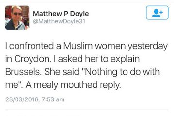“I confronted a Muslim woman yesterday in Croydon. I asked her to explain Brussels. She said ’Nothing to do with me’. A mealy mouthed reply,” said the post from a Twitter account in Mr. Doyle’s name.