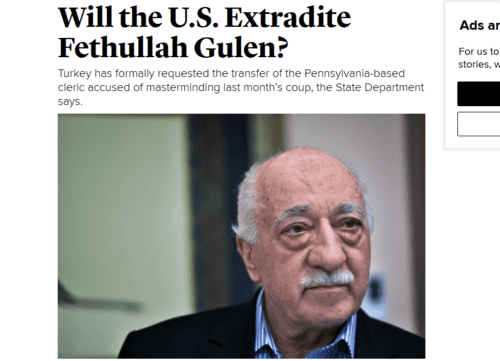 Will the U.S. Extradite Fethullah Gulen?Don’t hand the Imam of the Poconos over to Erdogan’s sense of fair play, indict him here in the U.S. on Racketeer Influenced Corrupt Organization (RICO) charges of using immigration fraud to skim hundreds of millions of American taxpayer dollars off the 160+ charter schools his organization appears to run in our country. Put him on trial in America for his crimes against Americans.Turkey has formally requested the transfer of the Pennsylvania-based cleric accused of masterminding last month’s coup, the State Department says.