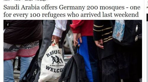 Saudi Arabia offers Germany 200 mosques – one for every 100 refugees who arrived last weekend[Comment at Unz.com.]Saudi Arabia has reportedly responded to the growing number of people fleeing the Middle East for western Europe – by offering to build 200 mosques in Germany.