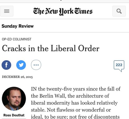 … Here in the dying days of 2015, though, something seems to have shifted. For the first time in a generation, the theme of this year was the liberal order’s vulnerability, not its resilience. 2015 was a memento mori moment for our institutions — a year of cracks in the system, of crumbling firewalls, of reminders that all orders pass away. …