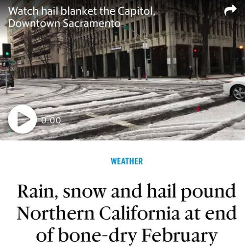 Today, a friend sent me a photograph from just north of Sacramento. The northern part of the state is getting snow and hail after a long period of no precipitation.[Rain, snow and hail pound Northern California at end of bone-dry February, By Dale Kasler and Benjy Egel, SacBee, February 26, 2018]