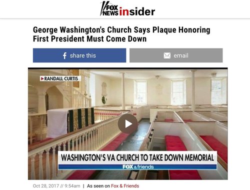 Leaders at the church that George Washington attended decided that a plaque honoring the first president of the United States must be removed.It’s the “all are welcome—no exceptions” bit that gets me. Does it include American patriots? Sons of Confederate Veterans? Daughters of the American Revolution? Descendants of the Washington and Lee families? White people? Christians?Christ Church in Alexandria, Virginia will take down a memorial marking the pew where Washington sat with his family, saying it is not acceptable to all worshipers.