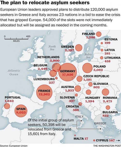 Washington Post story on the invasion of Europe features this map of planned allocations of "migrants"—Portugal gets so many, Spain, being larger, gets more, Estonia gets 199, e