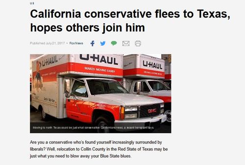 California conservative flees to Texas, hopes others join him, Fox News, July 21, 2017Are you a conservative who’s found yourself increasingly surrounded by liberals? Well, relocation to Collin County in the Red State of Texas may be just what you need to blow away your Blue State blues.