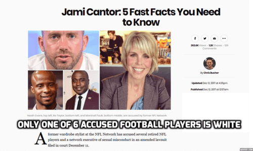 Heavy.com has a Five Fast Facts piece about the lawsuit and Cantor, the victim/accuser, and has photographs of the accused. It turns out one of the six ex-football players is white (Heath Evans) as is network executive Eric Weinberger. She was also harassed by talent coordinator Marc Watts, but he's black too.