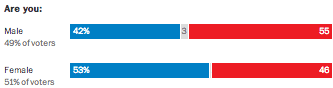 So that’s a gender gap of either 11 points or 9 points, depending upon party (males vote more 3rd Party), so call it 10 points.