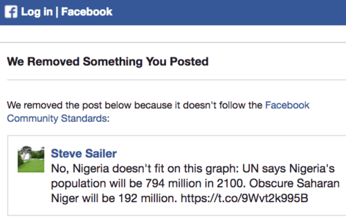 But don’t discuss UN forecasts of Niger’s population growth on Facebook. That violates community standards.