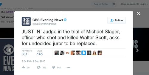 JUST IN: Judge in the trial of Michael Slager, officer who shot and killed Walter Scott, asks for undecided juror to be replaced.The CBS Evening News tweet did not link to any story. This tweet is now gone—see Archve.is of Google Cache here.— CBS Evening News (@CBSEveningNews) December 2, 2016