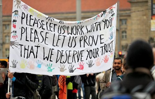 Fake Refugees in Germany Hoist an ENGLISH-Language Sign, Expressing Fake Sentiments, in Order to Pull Heartstrings in America—But Who Wrote It For Them?