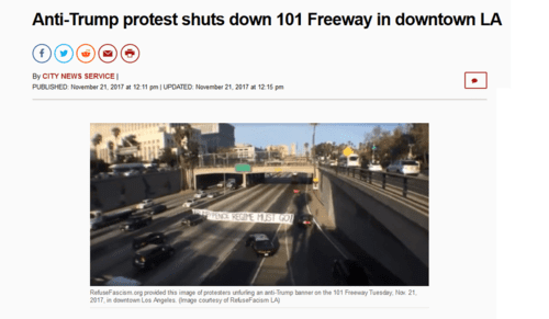 LOS ANGELES — A few protesters briefly blocked traffic on the northbound 101 Freeway in downtown Los Angeles before being hustled off of the roadway by authorities.Also, the lady videoing this and giving us her invaluable commentary has her finger part way over the lens.The protesters unveiled an anti-Trump banner shortly after 8 a.m. near the Los Angeles Street onramp to the freeway, the California Highway Patrol reported.