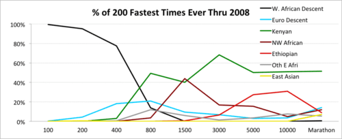 The Kenyans’ northern neighbors, the Ethiopians (red line), don’t emerge until 3000 meters (I’ve averaged the 3000m steeplechase and the 3000m flat race). They peak at 5000 and 10000 meters.