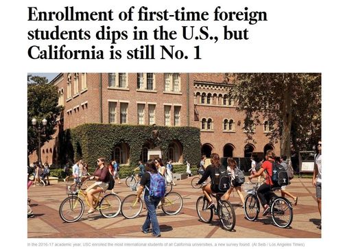Enrollment of first-time foreign students dips in the U.S., but California is still No. 1, Los Angeles Times, November 13, 2017After years of rapid growth, enrollment of first-time international students in U.S. colleges and universities dipped last year amid concerns about political uncertainty, tuition increases, visa delays and reductions in scholarship money, an annual survey found.