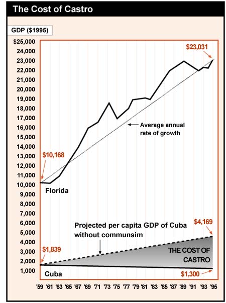 In the 1990s, Peter Brimelow did an article for Forbes on The cost of Castro (March 23, 1998) in which he pointed out that incomes had gone down with, at that time, only 40 years of Communist rule, the last 10, at that point, without the backing of the former Soviet Union. Cuba is really poor, and it's only Communism that keeps it poor.