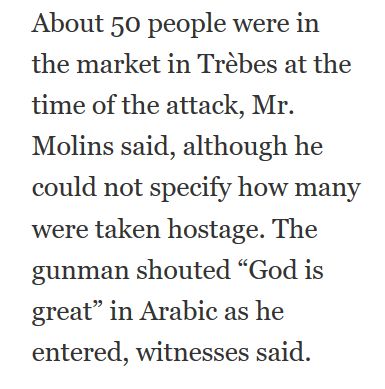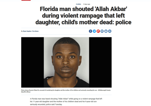 Florida man shouted 'Allah Akbar' during violent rampage that left daughter, child's mother dead: police, By Ryan Gaydos, Fox News,Presumably, he was inspired to shout "Allah Akbar" by contact with, or admiration for, some Black Muslims, plus whatever drug- or schizophrenia-fueled rage that made him commit this crime, but it's not an example of jihad. However, when it is jihad, the NYT has adopted an interesting way of dealing with the "Allah Akbar" cry—see this from Lion Of The BlogosphereA Florida man was heard shouting “Allah Akbar” while going on a violent rampage that left his 11-year-old daughter and the mother of his children dead and his 9-year-old son seriously wounded, police said Tuesday.