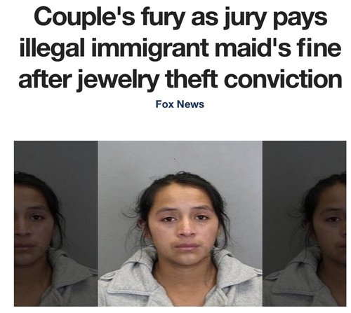 Jury foreman Jeffrey Memmott told The Washington Post the jurors felt sympathy for the woman who testified she dropped out of school after sixth grade, had one child and was pregnant with another but was not employed.“The general sentiment was she was a victim, too,” Memmott said. “Two of the women (jurors) were crying because of how bad they felt. One lady pulled out a $20 bill, and just about everybody chipped in.” [Couple's fury as jury pays illegal immigrant maid's fine after jewelry theft conviction, Fox News, December 8th 2017.]