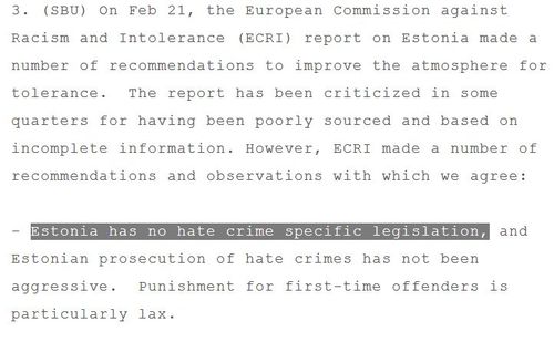 - Estonian authorities ought to add the teaching of the benefits of diversity and living in a multicultural society in school programs.Oh, wait, sorry, that’s a 2006 cable from the U.S. embassy in Estonia to the Bush Administration State Department.- Estonian authorities need to provide support for the Press Council of Estonia and the Estonian Newspaper Association for training journalists on issues related to racism and racial discrimination.