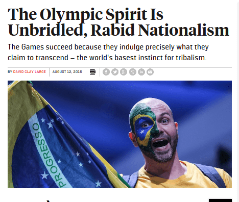 The Olympic Spirit Is Unbridled, Rabid NationalismWhat did those competing Greek city-states ever do for the advancement of human culture?The Games succeed because they indulge precisely what they claim to transcend – the world’s basest instinct for tribalism.