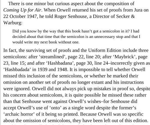 My version of Coming Up For Air is a 2000 Penguin Modern Classics reprint of the 1986 Martin Secker & Warburg Ltd edition … The semicolons you found in the online edition show as commas in my book.The link to Davison's note is Google Books search link, and may not work for everyone—here’s a screenshot of the relevant text.However, the editor Peter Davison includes a note on the text that discusses three semicolons in a surviving set of Orwell's proofs.