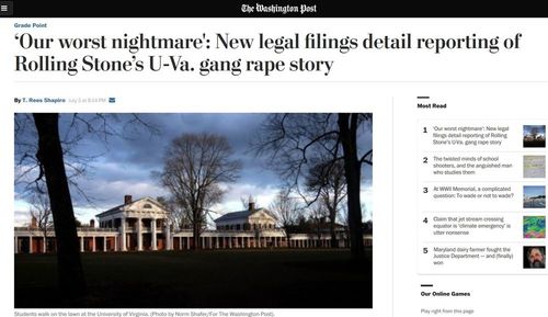 ‘Our worst nightmare’: New legal filings detail reporting of Rolling Stone’s U-Va. gang rape storyDown through history, a lot of embarrassing documents have gotten released right before a Fourth of July Weekend.By T. Rees Shapiro July 2 at 4:14 PM