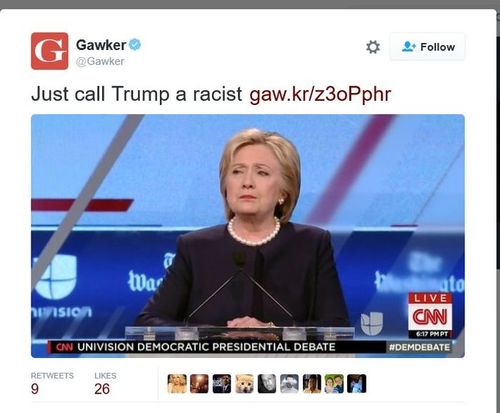 The problem is that they can't call Trump racist because they're vulnerable to the same charge—they're white. Sanders comes from the Whitopian state of Vermont, and his base is as white as Trump's is. [Angry White Males Propel Donald Trump–and Bernie Sanders, by Gerald F. Seib, Wall Street Journal, March 8, 2016]At tonight’s Democratic debate on Univision, moderator Karen Tumulty asked both candidates—point blank—whether or not they believed that noted racist Donald Trump was, in fact, a racist. The candidates’ collective response: Welllll.......