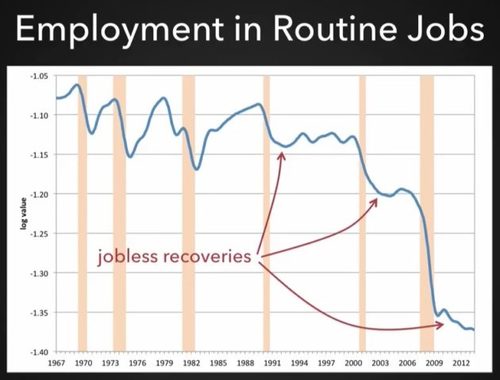 Historically, employment in routine jobs has bounced back after recessions. But the past three recessions and recoveries have shown significant declines in routine jobs, which makes for “jobless recoveries.” (Credit: Jaimovich and Siu, 2015, via Artificial Intelligence Now)