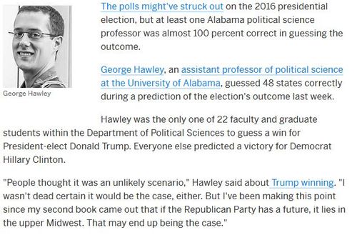 Rising poly sci star George Hawley predicted last Tuesday pretty well: