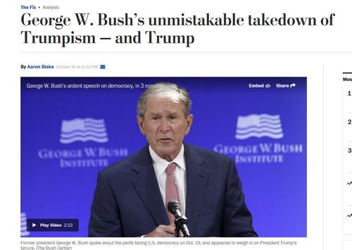 “Bigotry seems emboldened. … We’ve seen nationalism distorted into nativism. … Bigotry and white supremacy in any form is blasphemy against the American creed . … the very identity of our nation depends on passing along civic ideals. .... Bullying and prejudice in our public life … provides permission for cruelty and bigotry. … The only way to pass along civic values is to live up to them.”[ George W. Bush’s unmistakable takedown of Trumpism — and Trump ,by Aaron Blake, Washington Post, October 19, 2017]