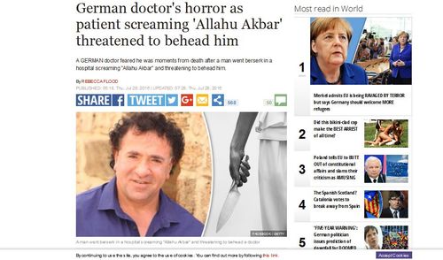 German doctor’s horror as patient screaming ‘Allahu Akbar’ threatened to behead himAlso from today’s Express:A GERMAN doctor feared he was moments from death after a man went berserk in a hospital screaming “Allahu Akbar” and threatening to behead him.